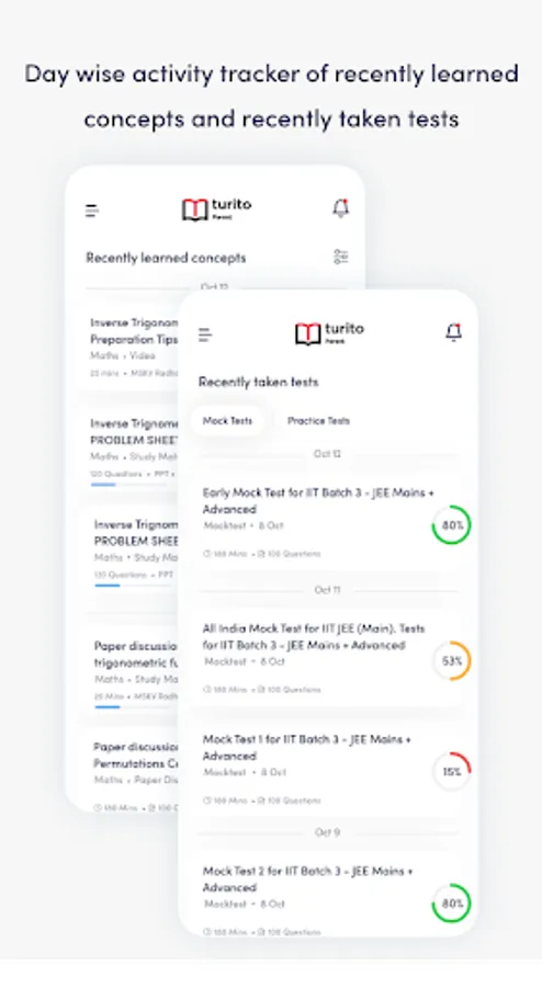 Turito Parent App is designed for Parents to provide them complete visibility into their child’s progress and performance, along with insights and recommendations to empower them in improving the child’s learning process. The app provides real-time updates about lecture attendance, daily practice tests, and mock test results with detailed attempt analysis to help parents stay on top of the child’s day-to-day activities on the Turito - Live Learning App.