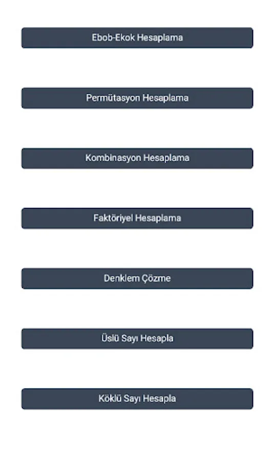 Our application serves you to easily perform the calculation operations (ebob-echo, permutation, combination, factorial, area, volume, etc.)