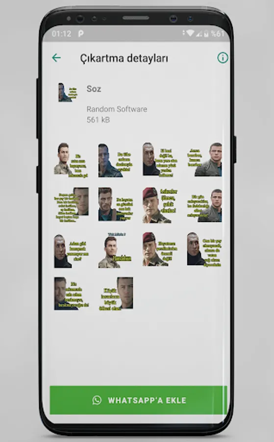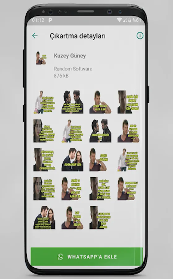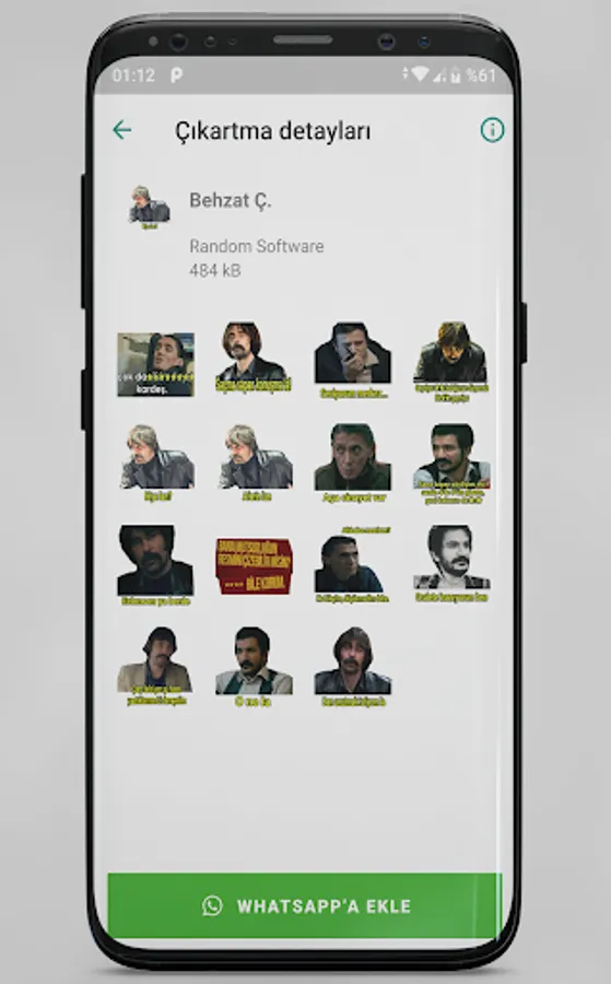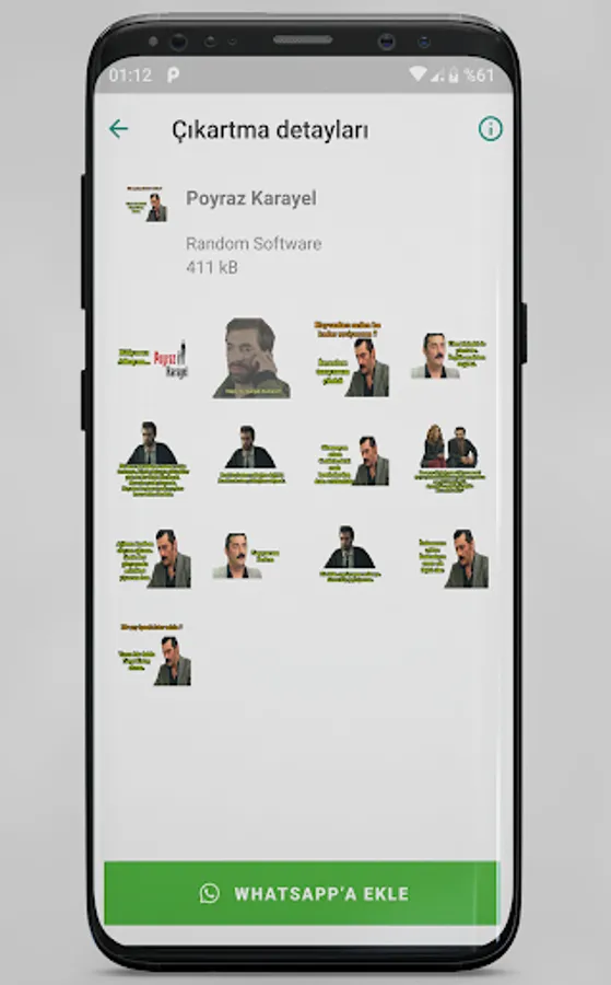 The application has the following stickers; domestic car stickers, cem Yılmaz stickers, caps stickers, mustafa kemal atatürk stickers, recep tayyip erdoğan stickers, ekrem imamoğlu stickers, lover stickers, ben fero stickers, team stickers etc. Includes 21 sticker packs.