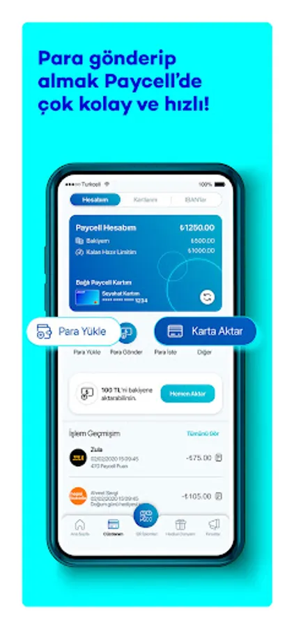 Paycell is always there for you to make your payments quickly and securely on a single platform. Once you register with your phone number, you can have a contract-free Paycell Card. Then, it’s time to transfer or request money, top-up Turkcell TL or Istanbul Card wherever you want!