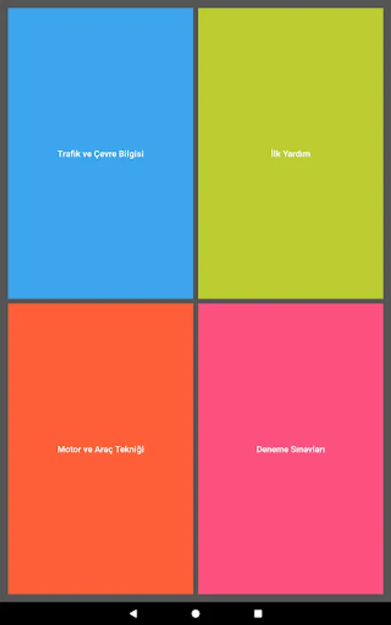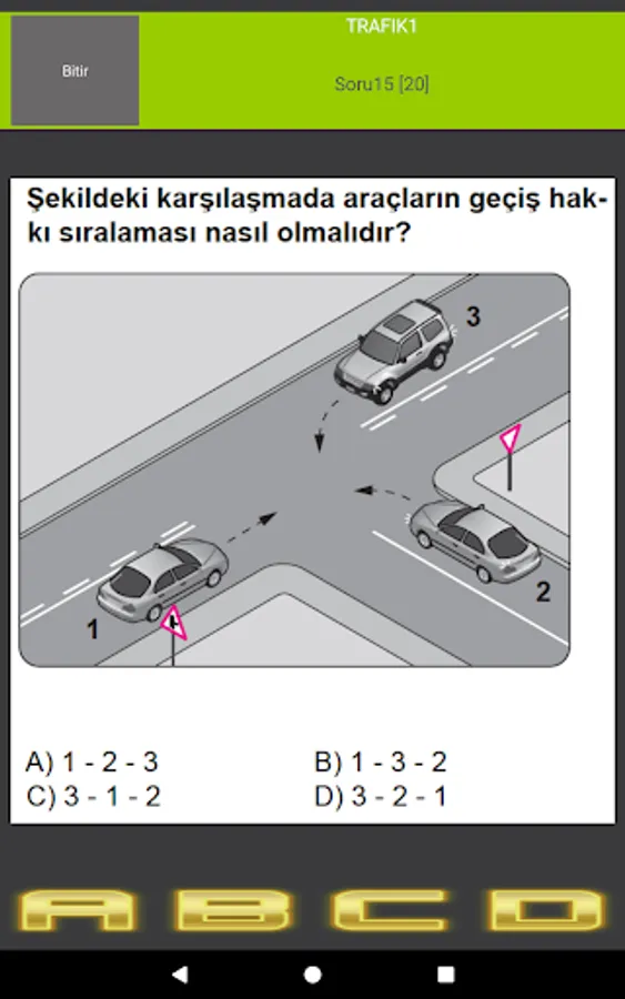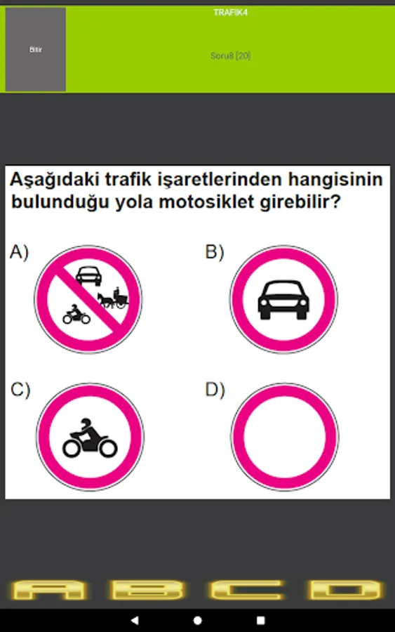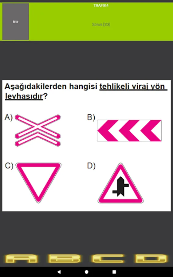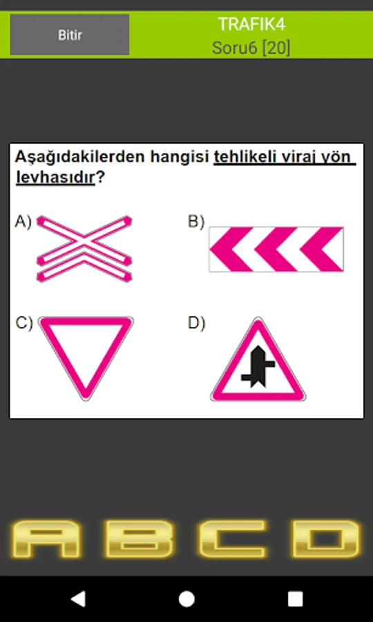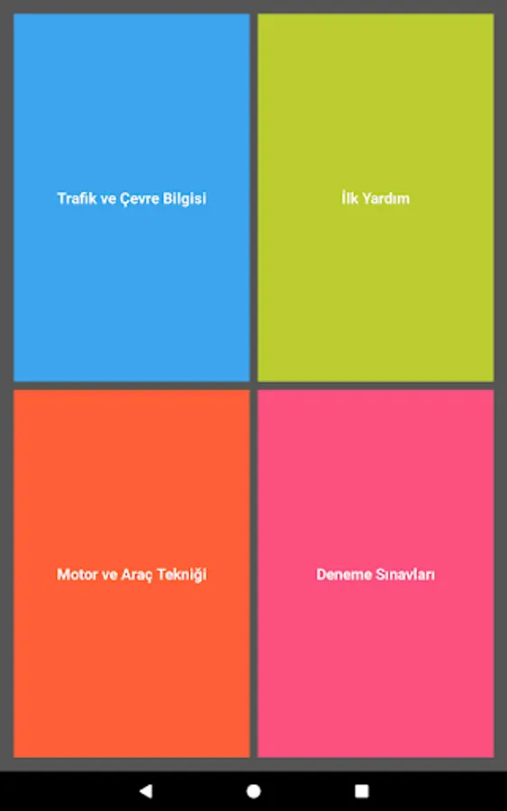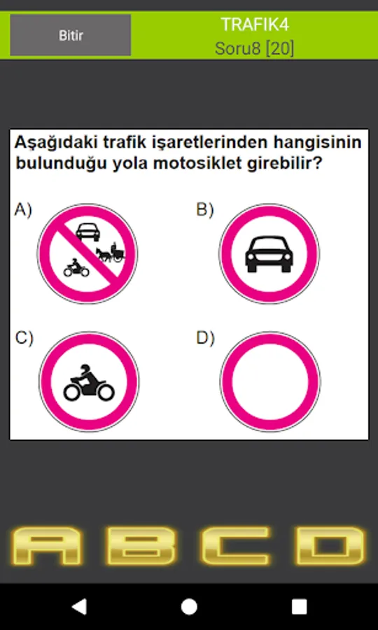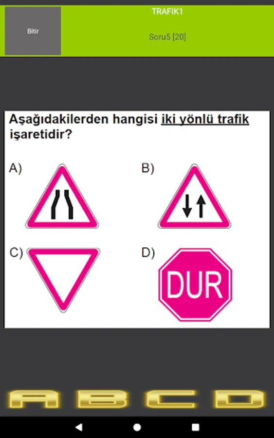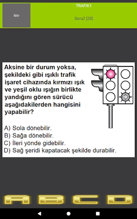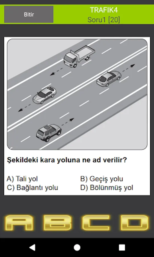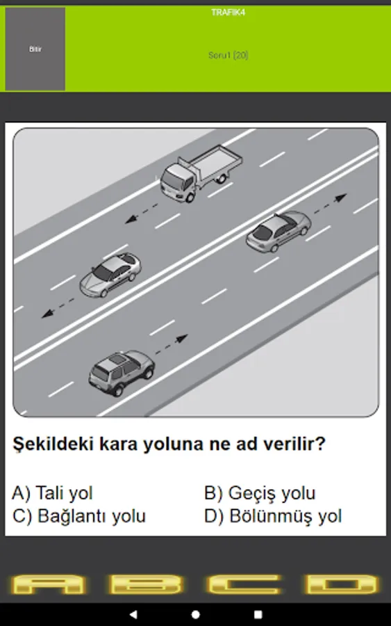 In the application designed in accordance with the new curriculum, you can reach all the first aid, traffic and motor questions ranging from 2019 Driving License Exam Questions to 2015 Driving License Exam questions; You can pass the driver's license exam without any difficulty by solving the essays of our license exam questions archive which consists of hundreds of questions.