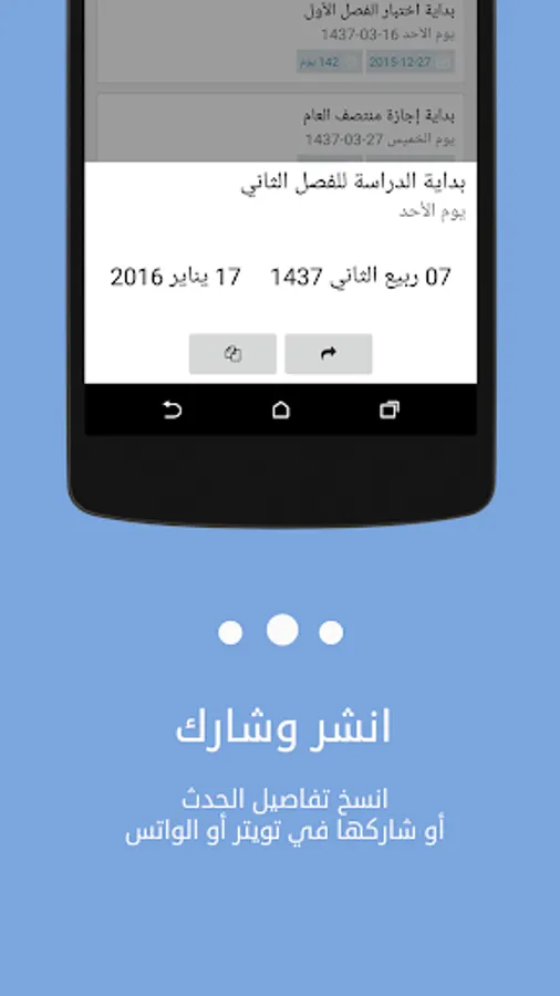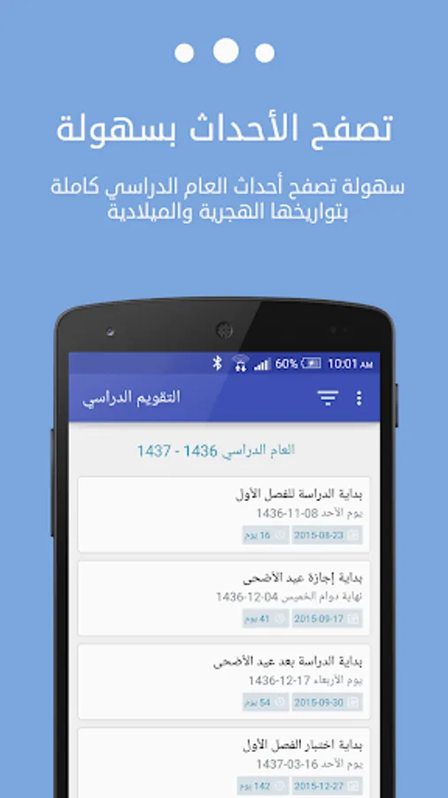 This application is the most important events of the school year has, according to the Ministry of Education plan in the Kingdom of Saudi Arabia. The application makes it easier for the teacher, the student, parent and others to know the most important events of the school year history Hijri and Gregorian.