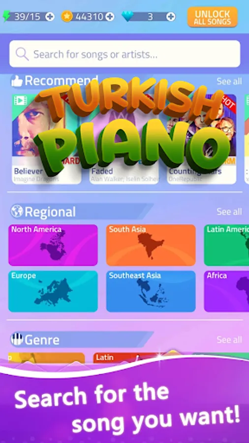 Türkçe Pop Şarkılar Piano Tiles, Türkçe pop müziğin büyüleyici şarkılarının sizi beklediği bir oyun deneyimi sunar. Türkçe popun enerjik ritimlerini, akılda kalıcı melodilerini ve içe işleyen seslerini deneyimleyin.