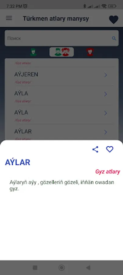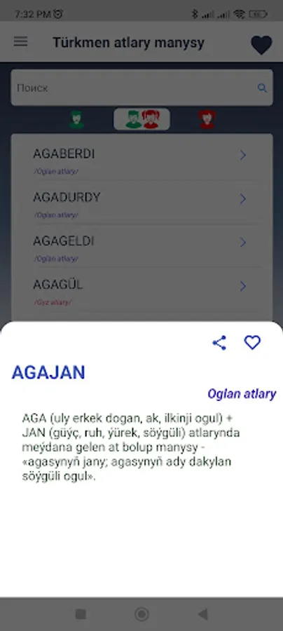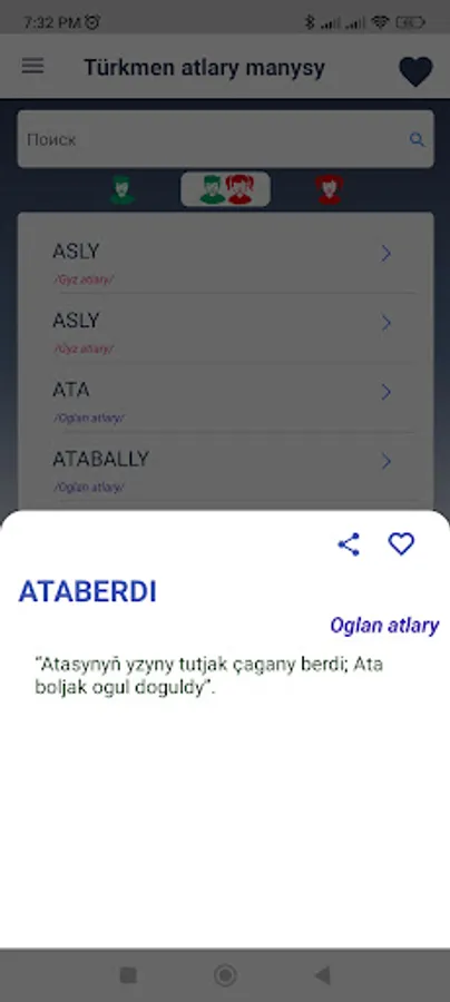 Doly düşündiriş: "Türkmenistanyň at taryhynyň üsti bilen baý taryhy we medeniýeti barada has köp zat bilmek isleýärsiňizmi? Bu Android programmasyndan başga bir zat gözlemäň! Atlaryň we olaryň manylarynyň giňişleýin maglumat bazasy bilen haýran galdyryjy dünýä öwrenip bilersiňiz. Türkmenleriň at dakmak konwensiýalary. Täze çagaňyzyň adyny gözleýän bolsaňyz ýa-da öz adyňyzyň gelip çykyşy bilen gyzyklanýan bolsaňyz, bu programma iň oňat çeşme. Onda näme üçin garaşyň? Indi göçürip alyň we türkmen atlarynyň manysyny öwrenip başlaň! "