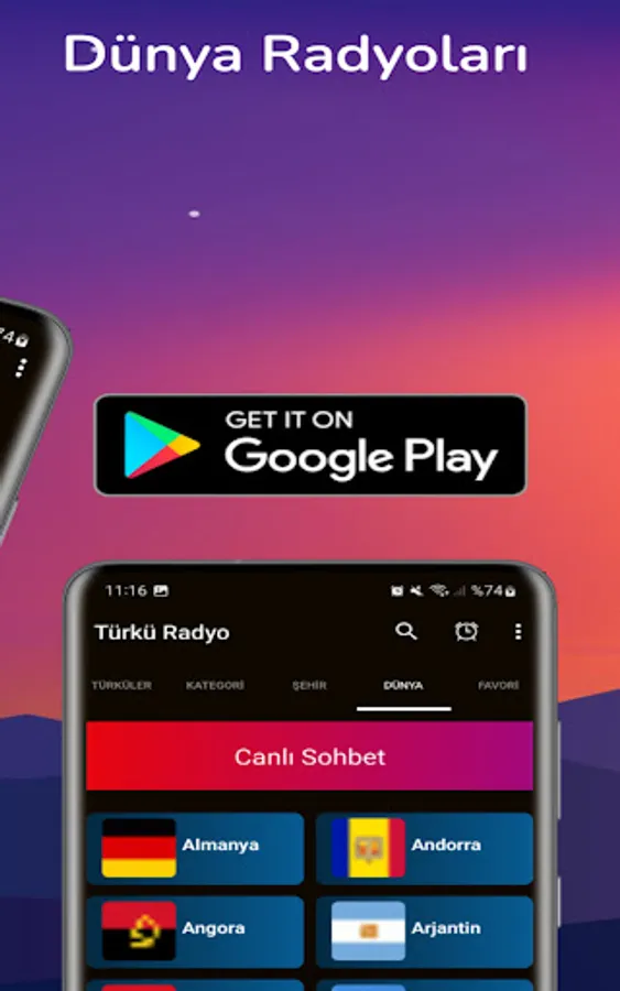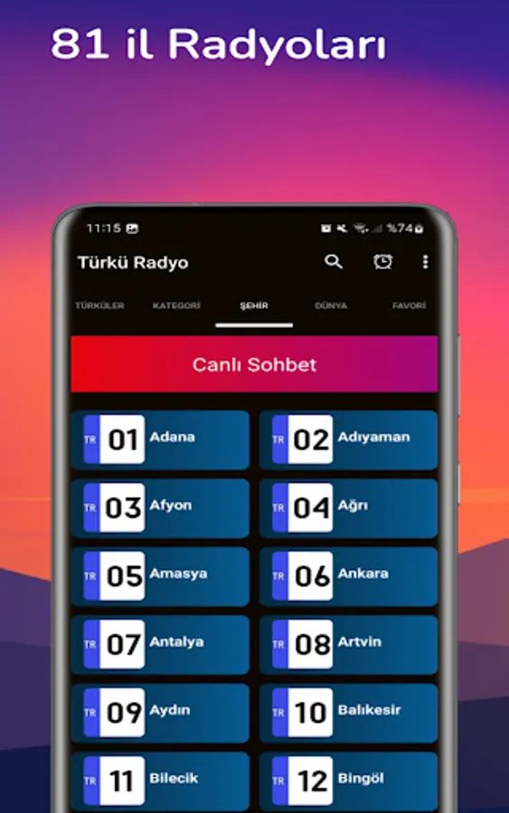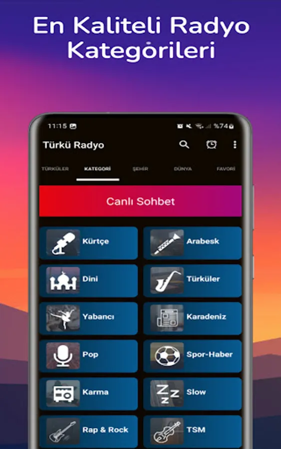 You can listen to other radios in our application if you want. Our other Live Radio categories in our application are; Arabesk Radio, Türkü Radio, Religious Radio, Pop Radio, Foreign Radio, Turkish Art Music, Rock Music, Rap Music, Jazz Music, Kurdish Radio, Kurdish Music, Sports Radio, News Radio, 81 Province Radios, World Radios and Mixed Radios. You can listen together.
