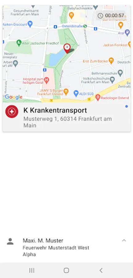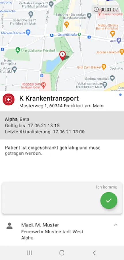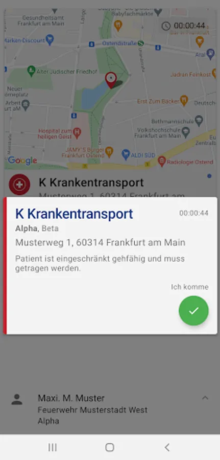 Content of the reports: The alarms from the control centers are sent as push notifications to the smartphones of the registered rescue workers and contain textual and visual information as well as detailed information on the operation (e.g. address with map section, type and severity, persons involved, Point in time) and any other attachments (e.g. documents, photos, videos). Via a confirmation button, the app records for the operations control center whether an operation is accepted or rejected / canceled.