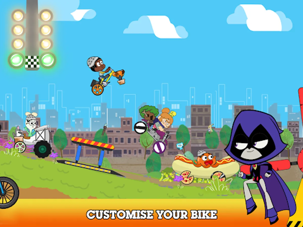 Ride your bike through fun-packed tracks with jumps and loops in this simple and fast-paced head-to-head biking rampage racing game. Whether you are into stunts, one-wheeling, dirt biking, stoppies, or speed thrills, BMX Champions will have you displaying your best skills while you manoeuvre your way through the obstacle course mayhem! Play as your favourite Cartoon Network character and jump on your customised bicycle ride and line up against other Cartoon Network characters. You will have to boost, balance and power to the finish line in this crazy racing course!