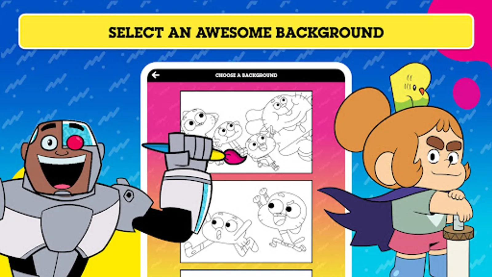 Explore a huge range of colour-in backgrounds and animated stickers featuring your favourite Cartoon Network Characters including: