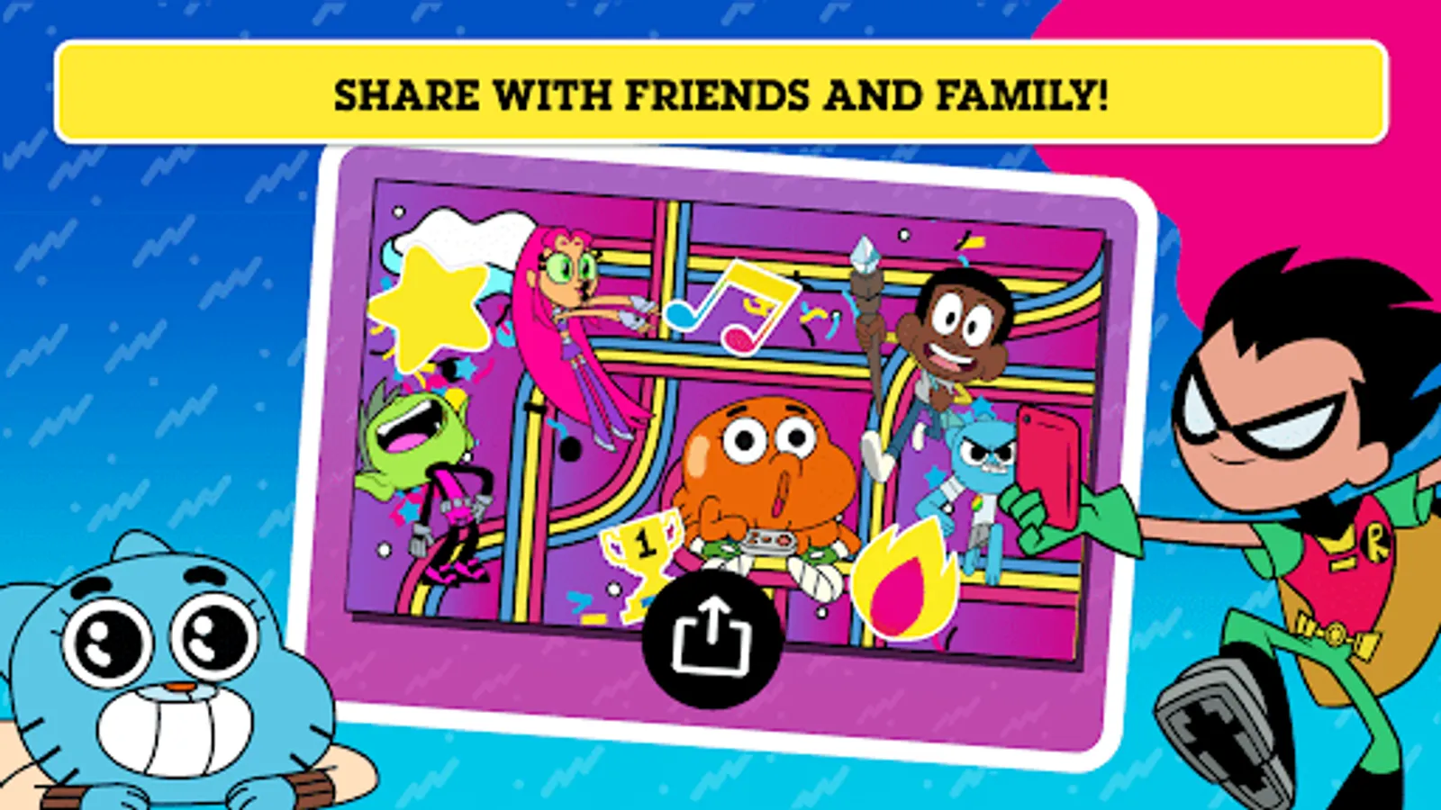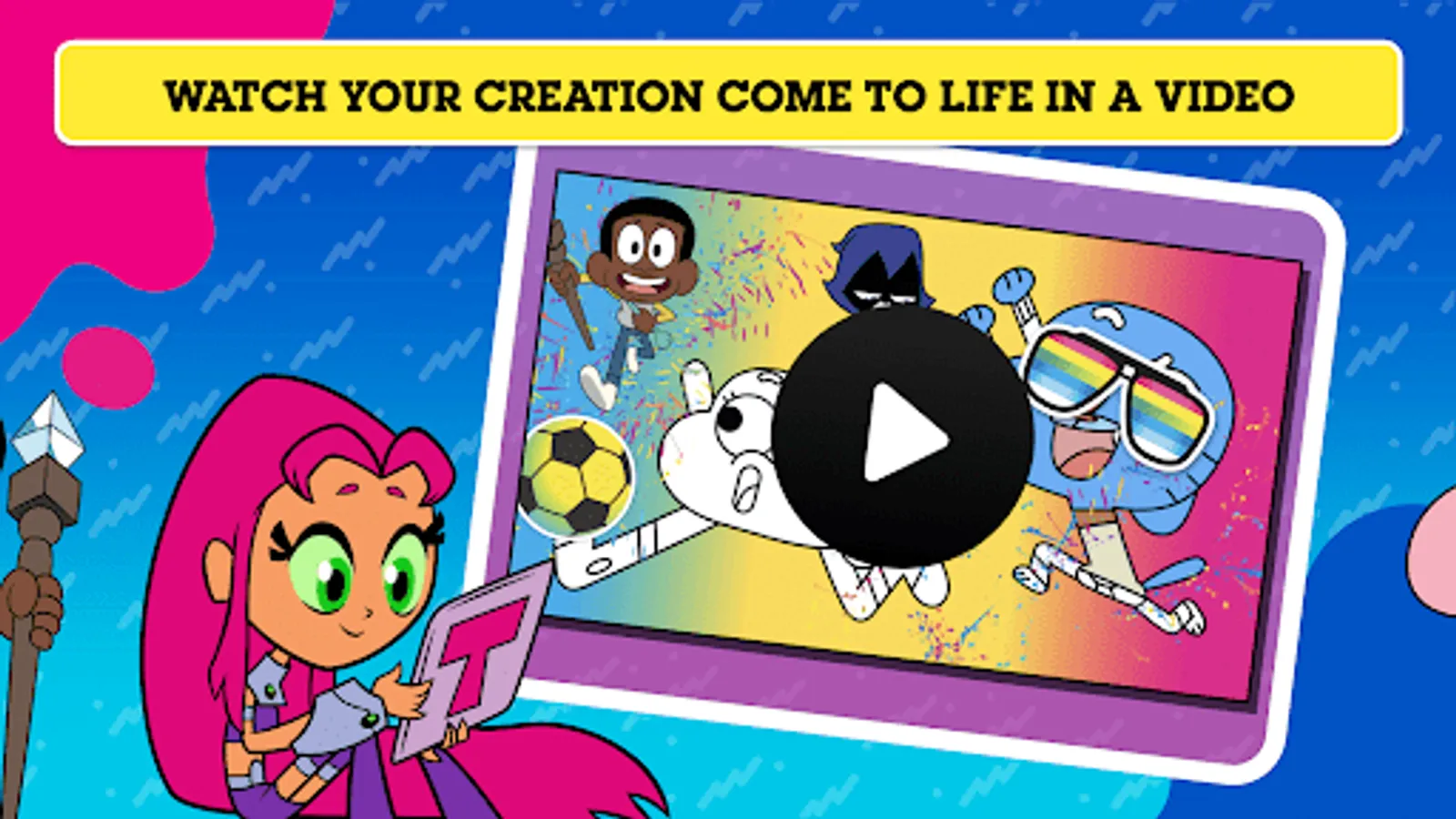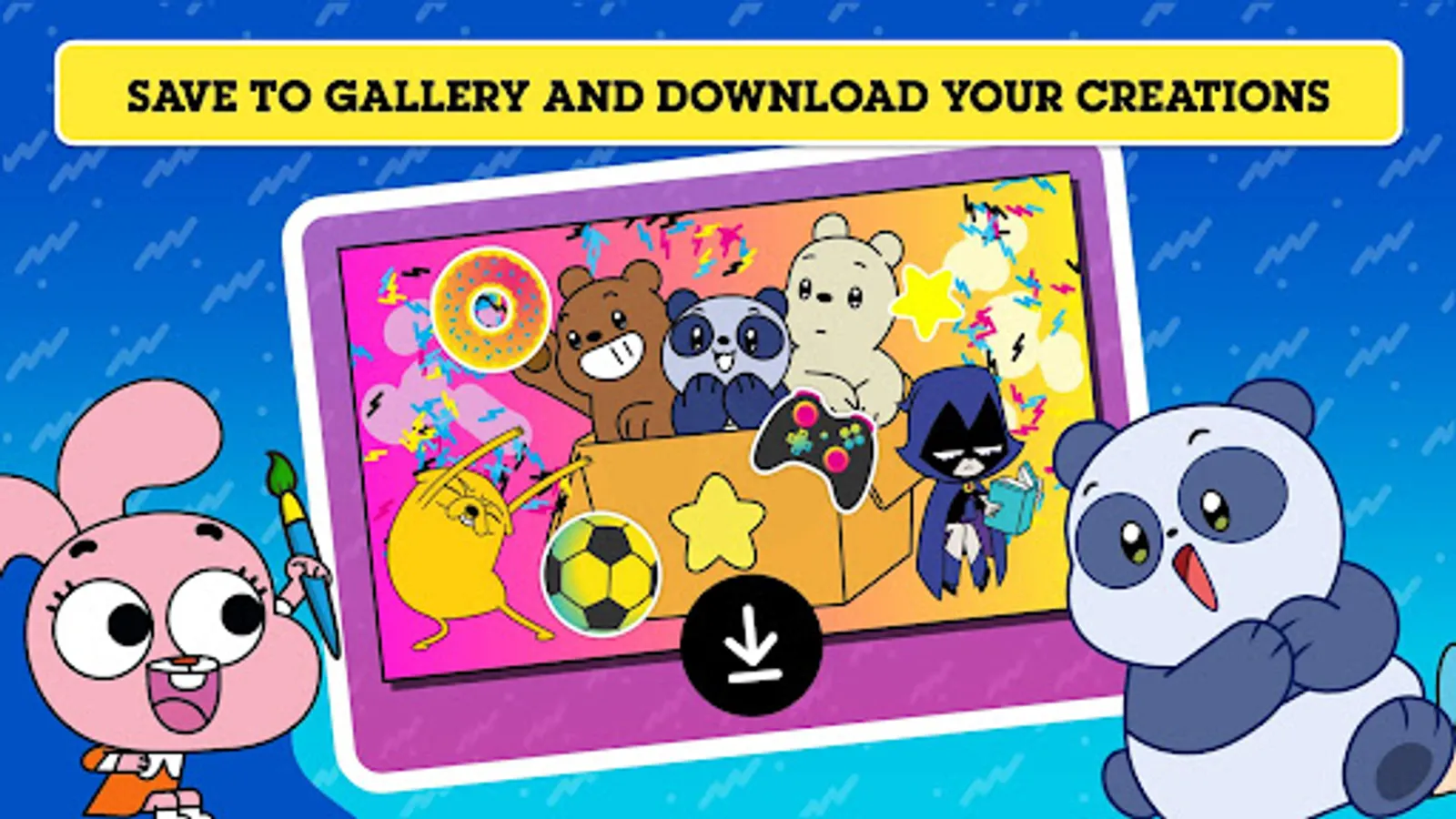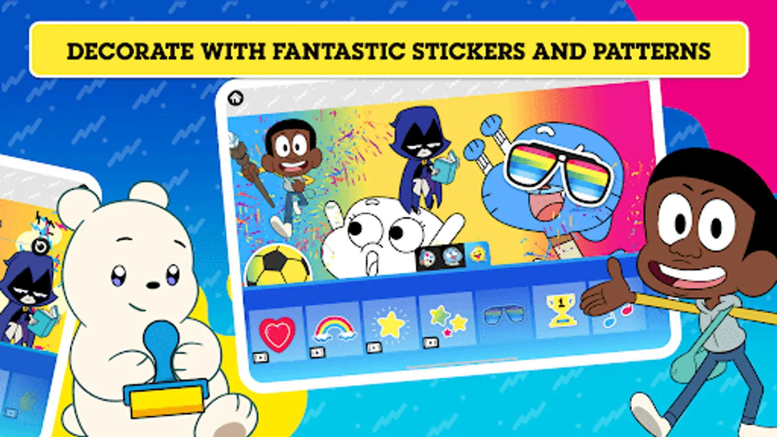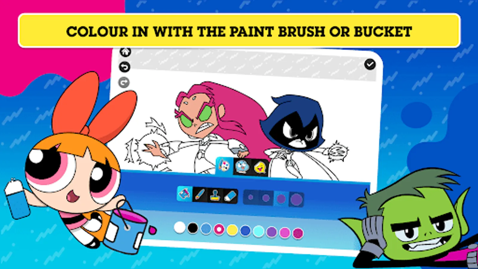 It's time to get creative with all of your favourite Cartoon Network characters! Choose from loads of colour-in backgrounds and explore a wide range of stickers including characters from The Powerpuff Girls, The Amazing World Of Gumball and We Baby Bears! Play with a variety of colouring tools, brushes, and more - then decorate your masterpiece with stickers! Watch your creation come to life as an amazing picture or an awesome animated video. Download your creation and share it with your family and friends!