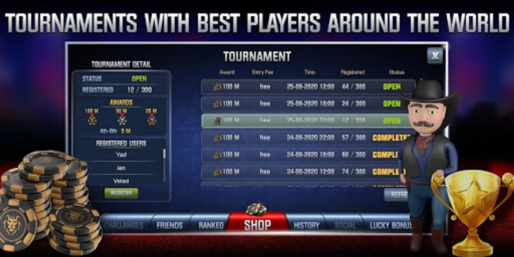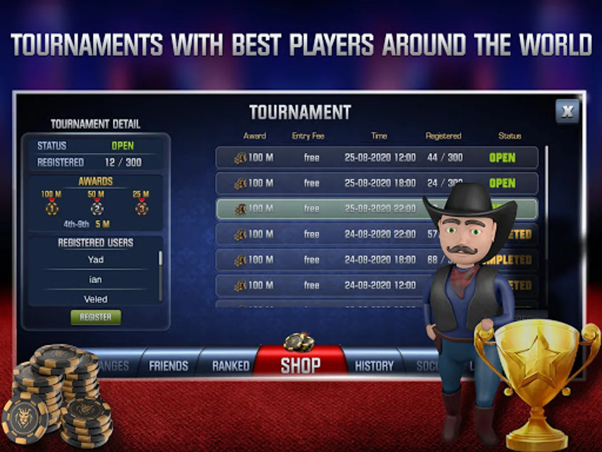 • TOURNAMENTS – Master your poker skills and gain the experience 3 times in a day every day! Participate in a monthly SPECIAL tournament where you can win lots of chips and Top the list of best players!