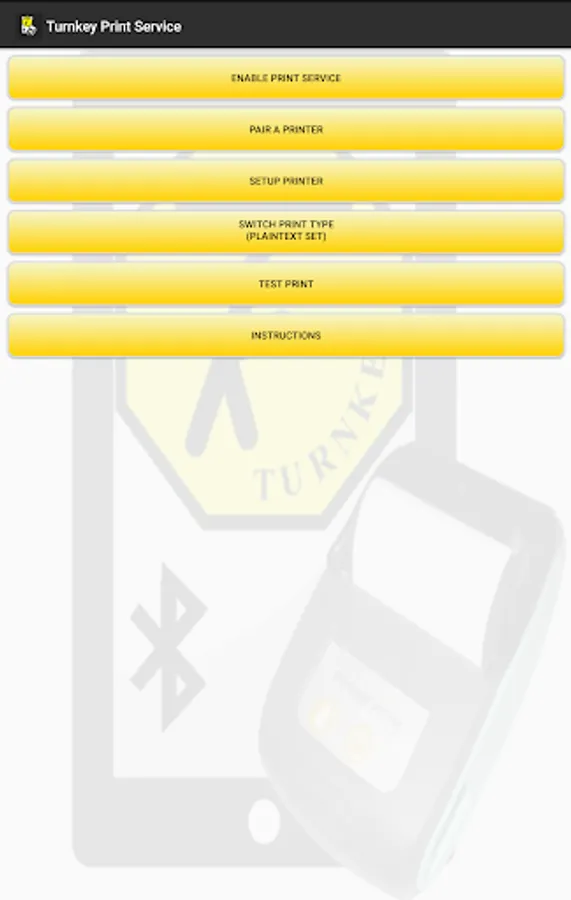 1. Make sure Turnkey Print Service is enabled in settings (Tap Enable Print Service button > Turnkey Print Service > Enable).