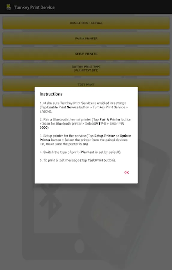 3. Setup printer for the service (Tap Setup Printer or Update Printer button > Select the printer from the paired devices list, make sure the printer is on).