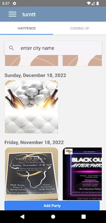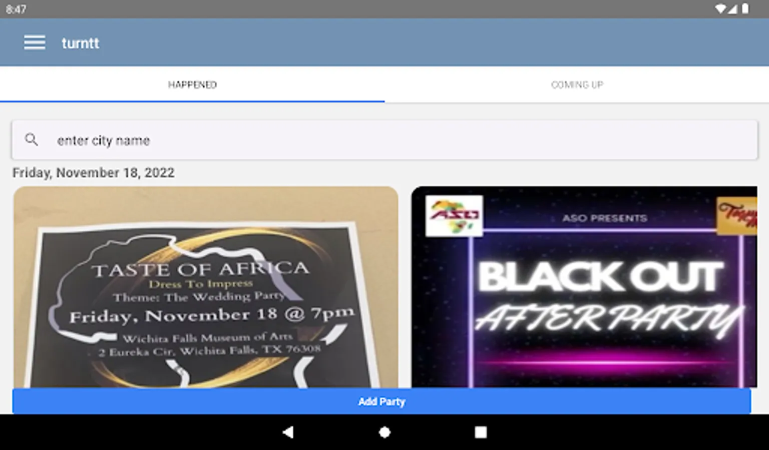 The easy way to find out what's going on in your city. check out parties in your city through the app, you can also add your party to the app for people wanting to attend to find the information easily