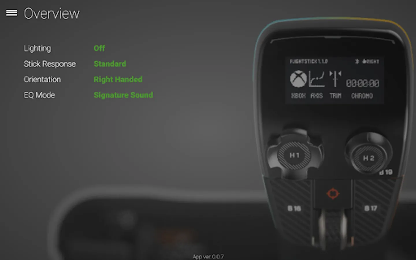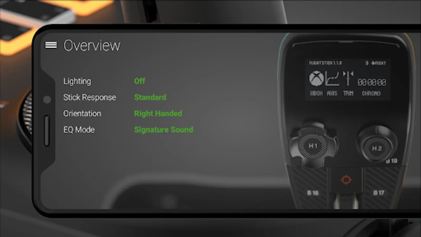 Use the VelocityOne Flightstick app to customise your settings from axis response, dead zones, lighting and orientation at the touch of your mobile device.