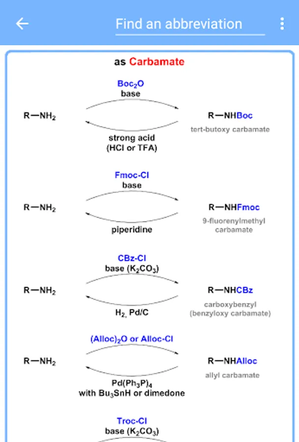The application is organized to provide a direct link between a reactant and its corresponding product, as well as the synthesis and protection reactions.