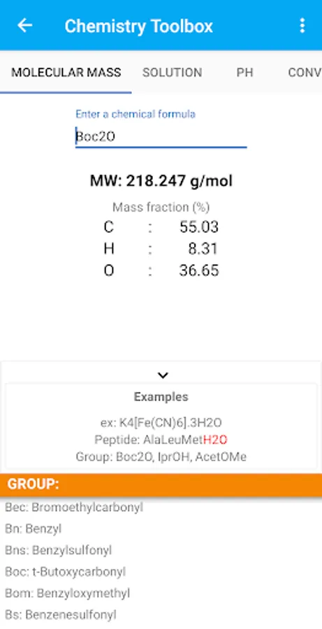 - The BEST MOLECULAR MASS CALCULATOR, by symbol or group abbreviation ex. K4Fe(CN)6.3H2O, Boc2O...