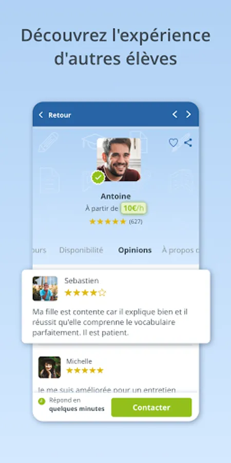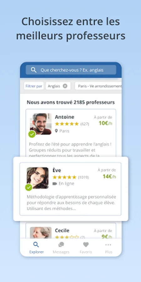 You can filter by subject, level, location, experience, opinions ... and then chat by chat before choosing. Remember: there are no contact limits, you can choose two or three and call on the one you like the most.
