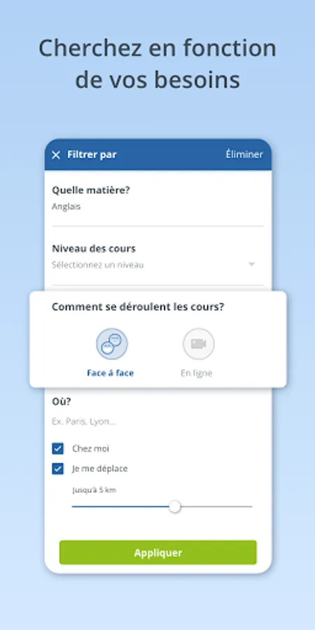 Do you want to take private lessons? Use the free Your Courses app to find the perfect private teacher whatever the subject (languages, math, tutoring, programming, yoga ...) near you.