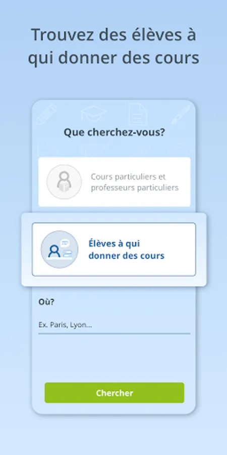 Vos Cours helps teachers easily find students looking for lessons in their area. Advertise your private lessons for free: publish your advertisement for the subject you want to teach and complete your profile. Don't forget to add a photo of yourself! it's your cover letter and the first thing students will see.