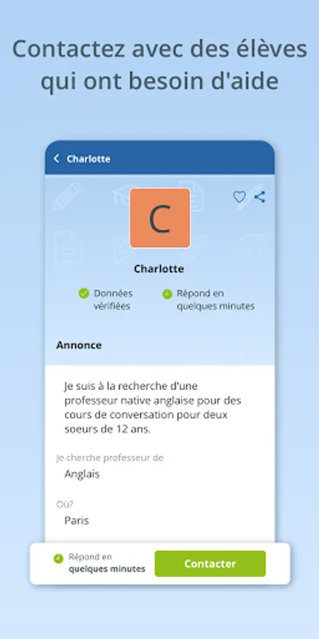 Publish your ad for free. Without commissions. You choose how much you want to earn. Flexible hours. Students will contact you through the app chat.