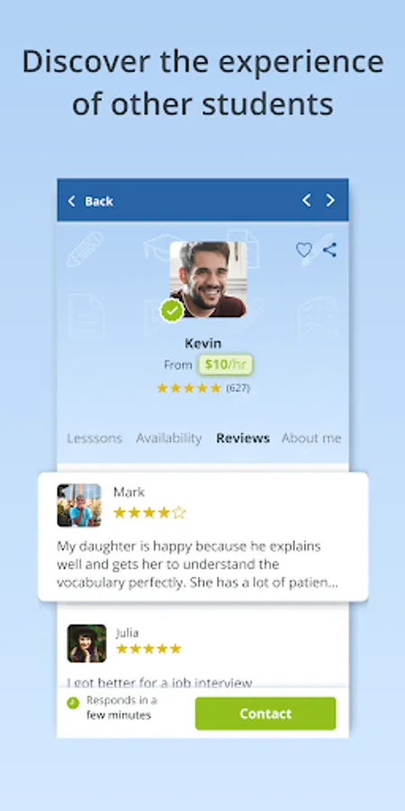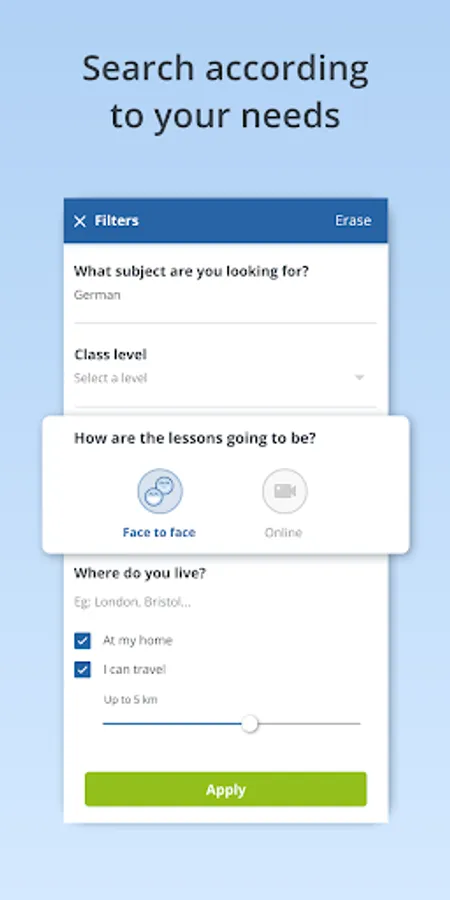 *Search for your teacher according to your needs: Choose by subject, price, timetable and location. In the FindTutors app, you will find tutors for more than 350 subjects: languages such as English, French, Russian and Japanese, school revision for children, programming, digital marketing and software such as Photoshop...