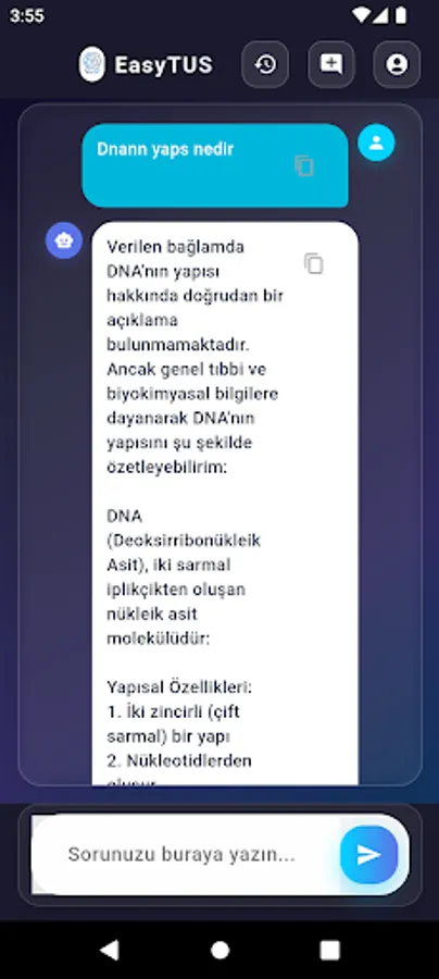 EasyTUS is an AI-powered question assistant for TUS candidates. Type your questions, see AI-generated answers, and search the web for the same question and compare it with AI summaries. Chat history is saved, so you can start a new conversation or try it out immediately in guest mode. Its modern interface, quick answers, source citations, and "Free Web Search" feature accelerate your exam preparation.