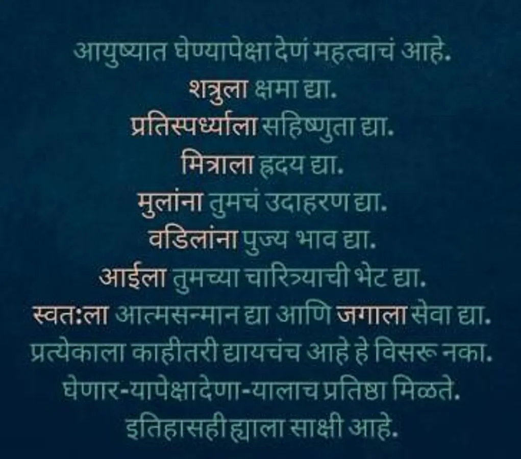 This app provide you the different categories of 'Marathi Quote' or 'Marathi Suvichar' and Good Thought in Marathi Share these Heart Touching lines of Suvichar with your friends or Loved Ones
