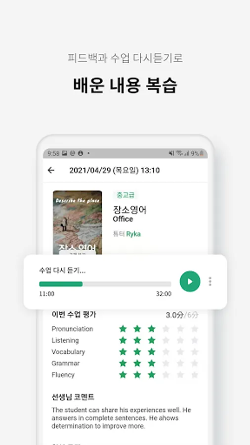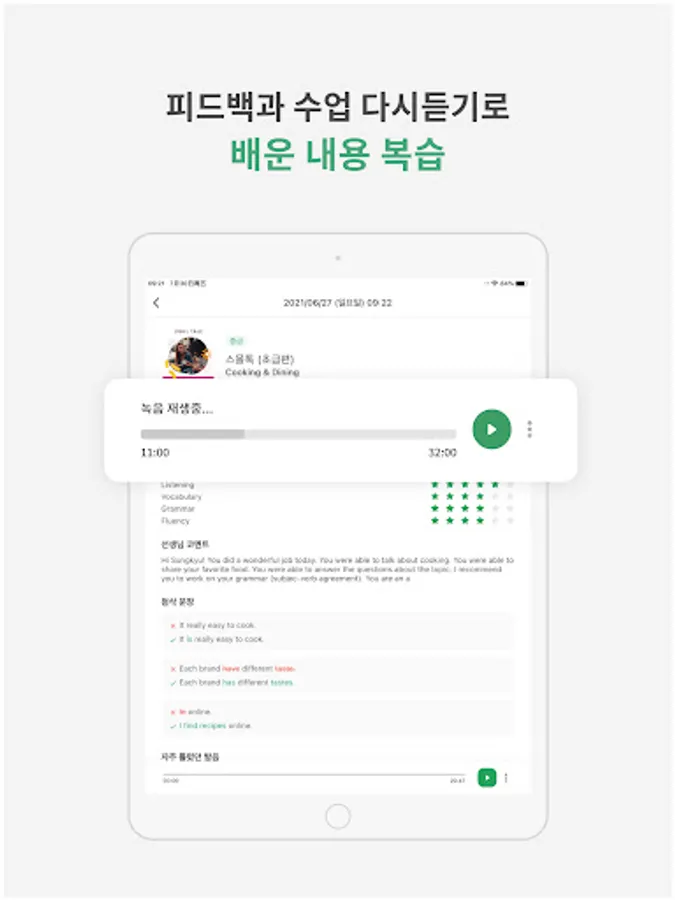 Feedback written by the tutor after each class, re-listening to the class, and providing chat content