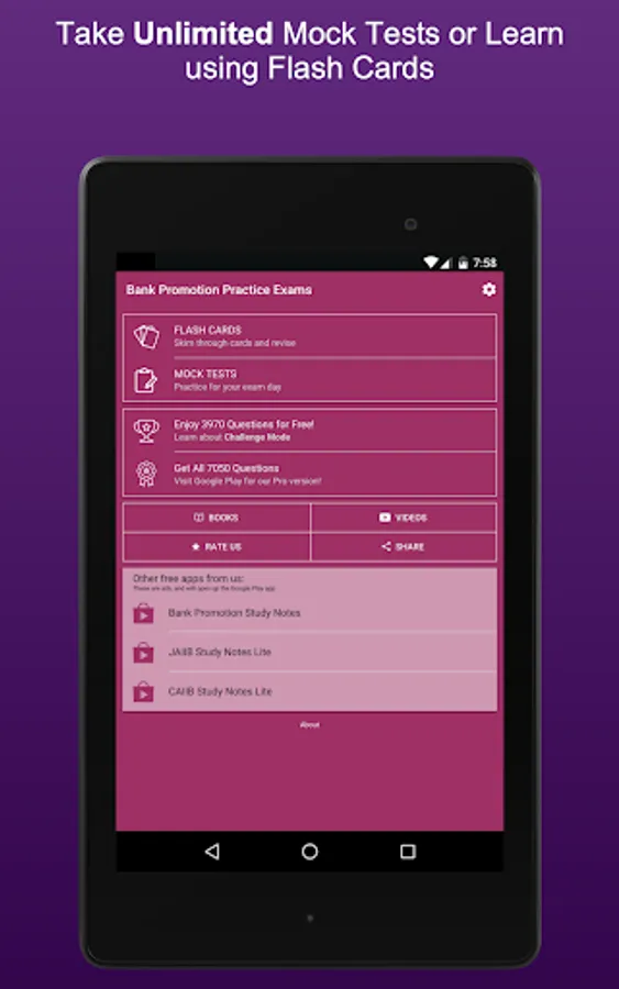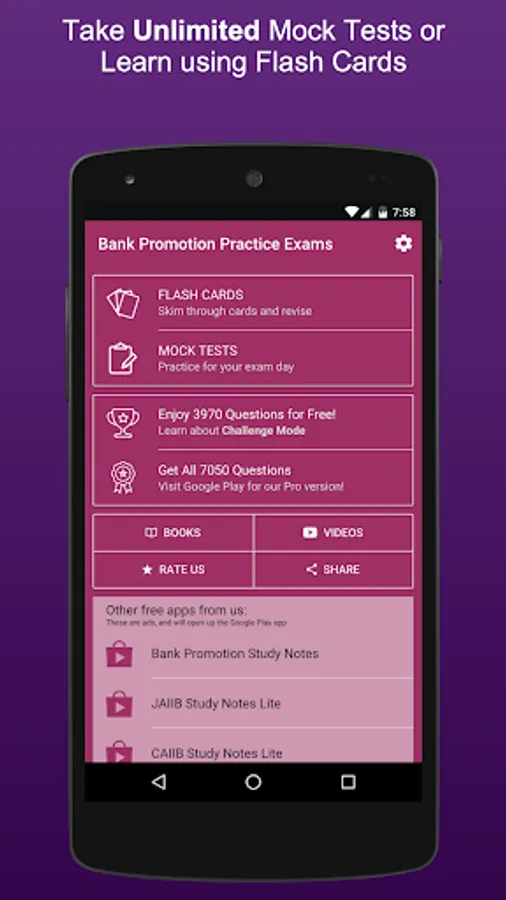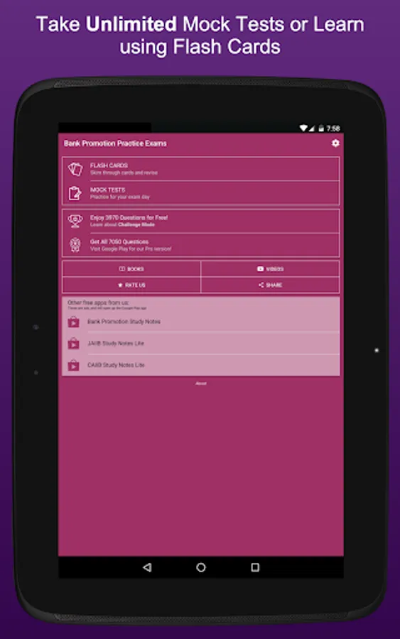 Prepare for Bank Promotion exams with this handy app containing 100 questions. Review using flash cards, or assess your readiness via mock exams. This is the "lite" version of the Bank Promotion Exams Pro app which has 800 questions. You can check the "pro" version here: https://play.google.com/store/apps/details?id=com.tutioncentral.bpepro