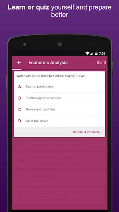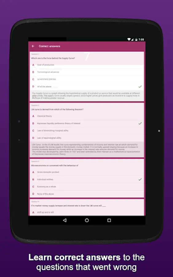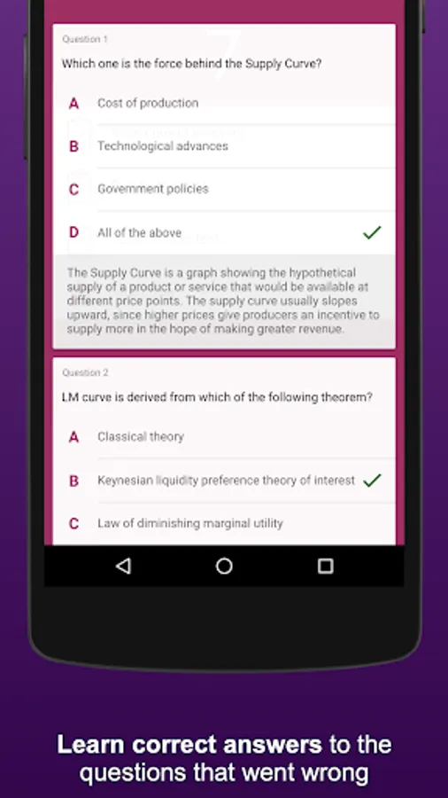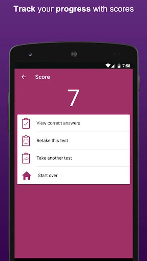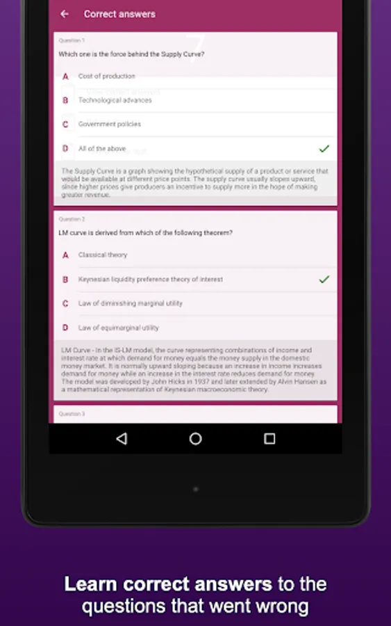 Review flash cards or take timed tests in convenient chunks of 10 at a time (10, 20 & 30 in the pro version); view correct answers then and there at the tap of a button. Get a different set in each consecutive session till you complete all the available questions in the bank.