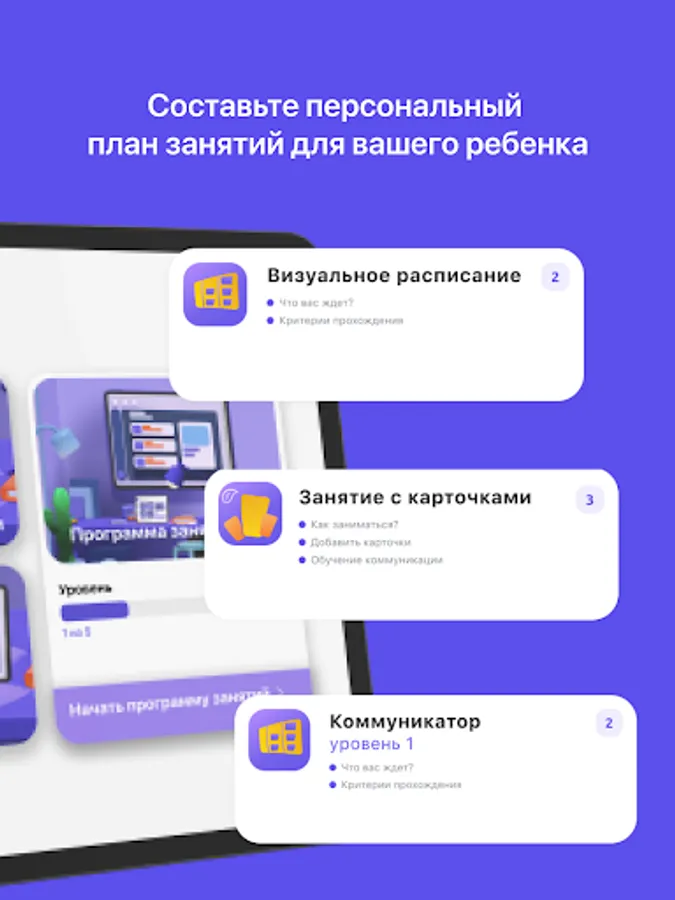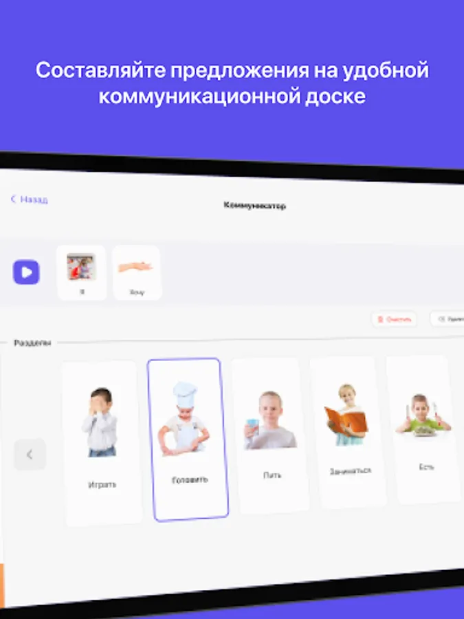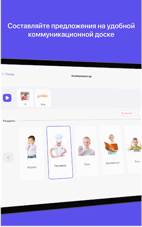 1. The Communicator module contains 7 levels of mastering non-verbal communication, where starting from simple forms of communication, limited to one word, such as "Apple", you can gradually develop communication to the level of complex sentences "Mom give me a big red apple please." For communication, you can add any necessary cards - that is, words in an unlimited number