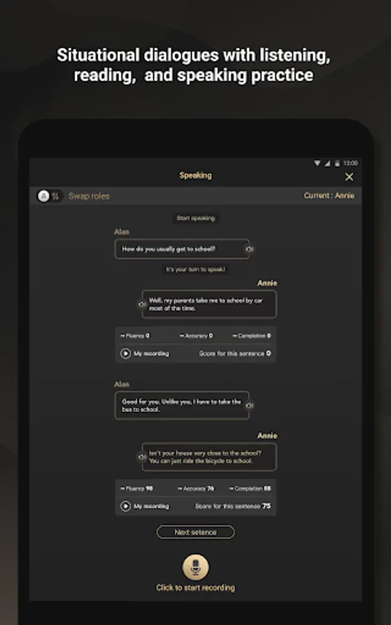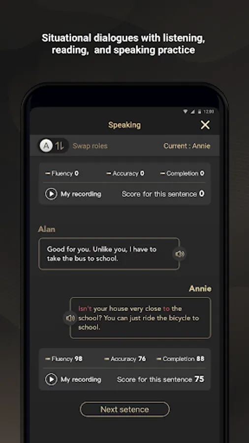 *AI pronunciation analysis: Situational dialogues with listening, reading, and speaking practice