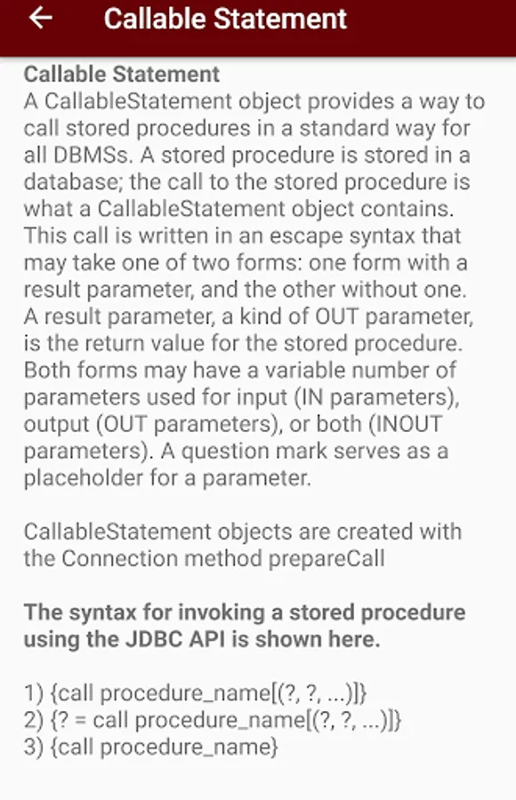 total 3types of statements like statment,prepared statement and callable statements are explained