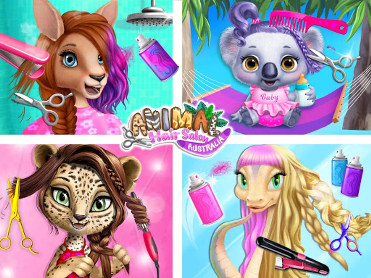 Crazy Animal Hair Salon goes to sunny Australia! Pack your hairstyling tools and get ready for new virtual pet fashion makeovers and animal beauty salon adventures! Meet the cute pet beauty salon clients: leopard Amy, baby koala Maggie, kangaroo Sydney and snake Crystal. Help your new pet friends express themselves through style with crazy haircuts, beautiful makeup and fashionable outfits in the best pet beauty salon game for girls!