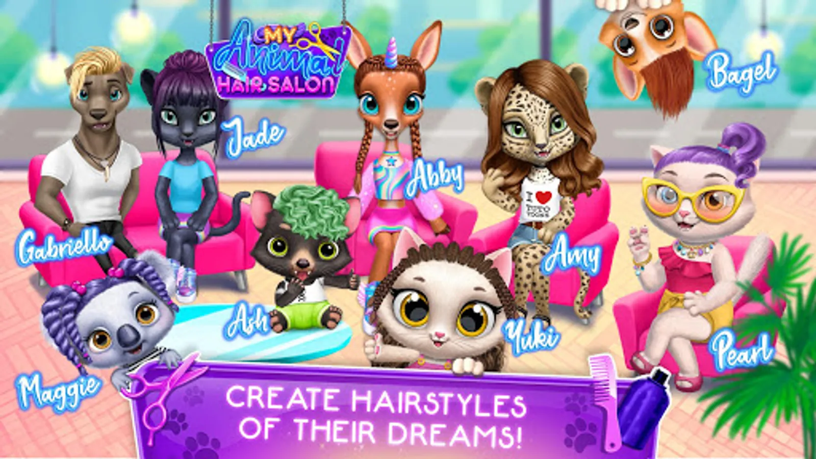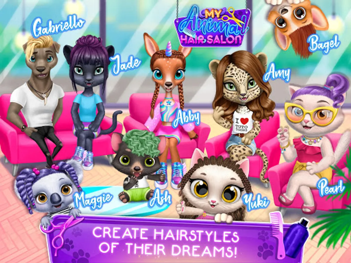 Style hair for kids' beloved and brand new characters: leopard Amy, panda Lu, cat Pearl, baby koala Maggie, Tasmanian devil Ash, dog Gabriello, corgi Bagel, goat Daisy, little cat Yuki, black panther Jade and their new animal friends — cute deer Abby and pink llama Gwen!