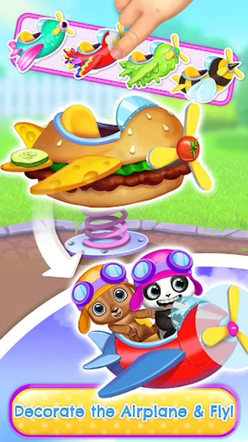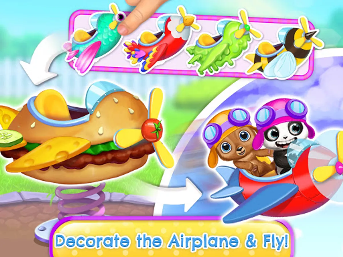 Try out all the super fun slides and catch candies! Time to get creative and decorate the airplane spring rider! Now baby panda Lu and friends can fly in the sky! But beware of obstacles! Let’s jump on a trampoline for kids and play with soap bubbles with the baby owl!