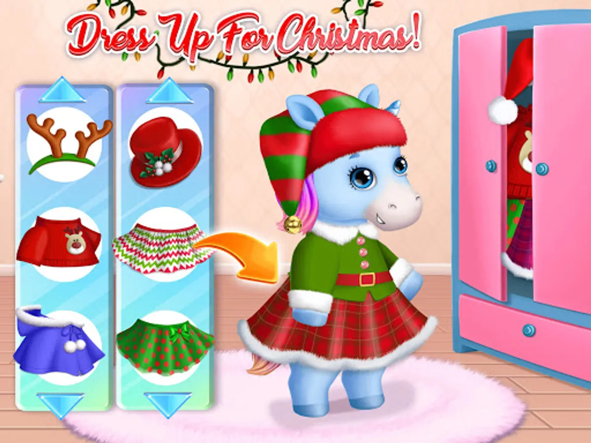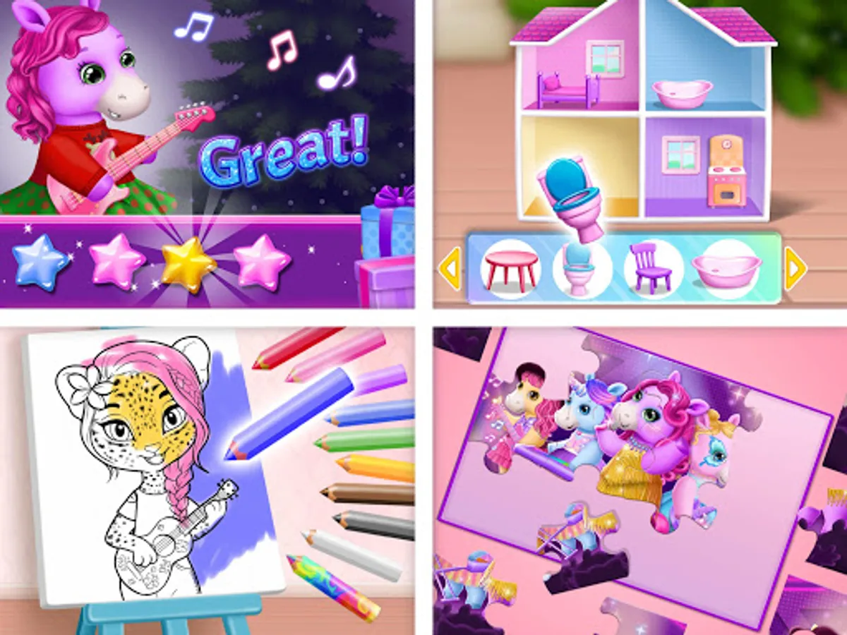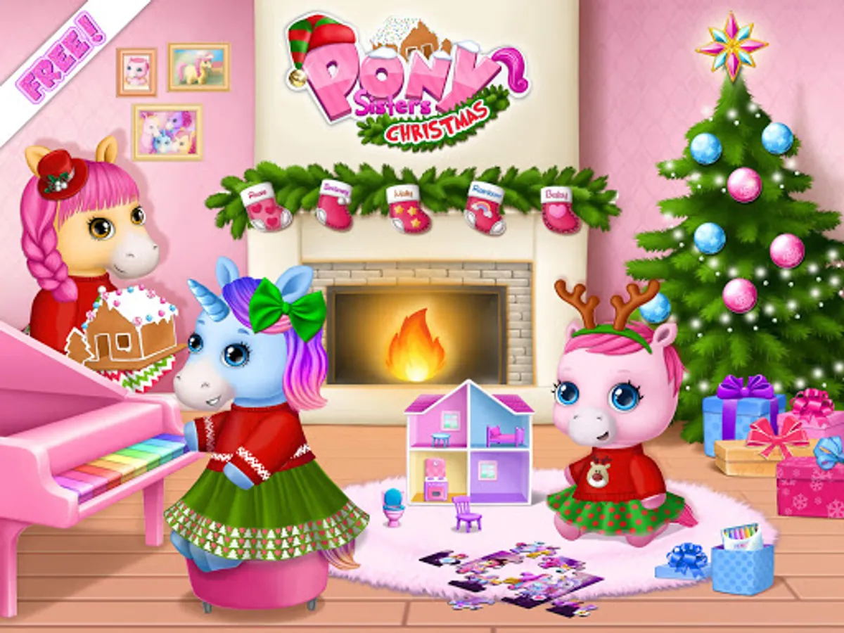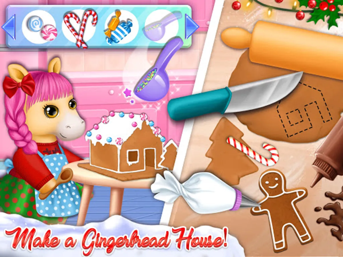 The big and beautiful pony family needs your help to get ready for Christmas. Give a hand to pony sisters Molly and Zoe and make a colorful and tasty gingerbread house. Feed an adorable and hungry baby pony. Learn how to play Jingle Bells on the piano and sing with the pony-pianist. Decorate a Christmas tree, choose bright fairy lights and add cool ornaments. Open all the Christmas gifts by the fireplace, play the guitar with Britney, help Rosie decorate a doll house, do puzzles and much more!