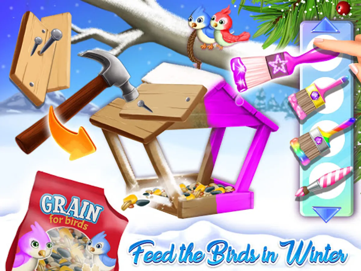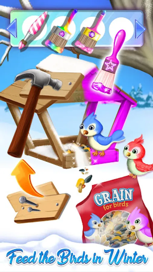 · Help adorable little birds in winter: fix and paint the feeder and add grains!