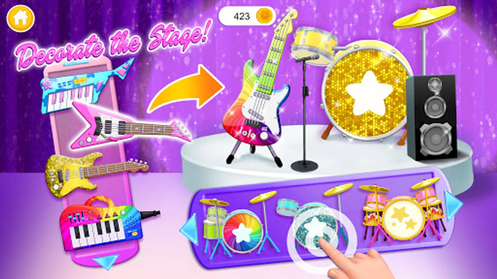 Get ready for the show tonight! Style hair for beautiful Alice and design the cutest pop star outfit. Take care of Emma's skin and do the perfect with glitter and shimmer. Welcome new superstar Lily to the band and play the drums together. Set up a superstar photoshoot and create the coolest concert poster. Play the piano with Taylor and get on stage with the pop star girls when you're ready to perform. Do awesome face paint to all the girls! Free your music talent and creativity: play, sing, dance and have tons of fun!