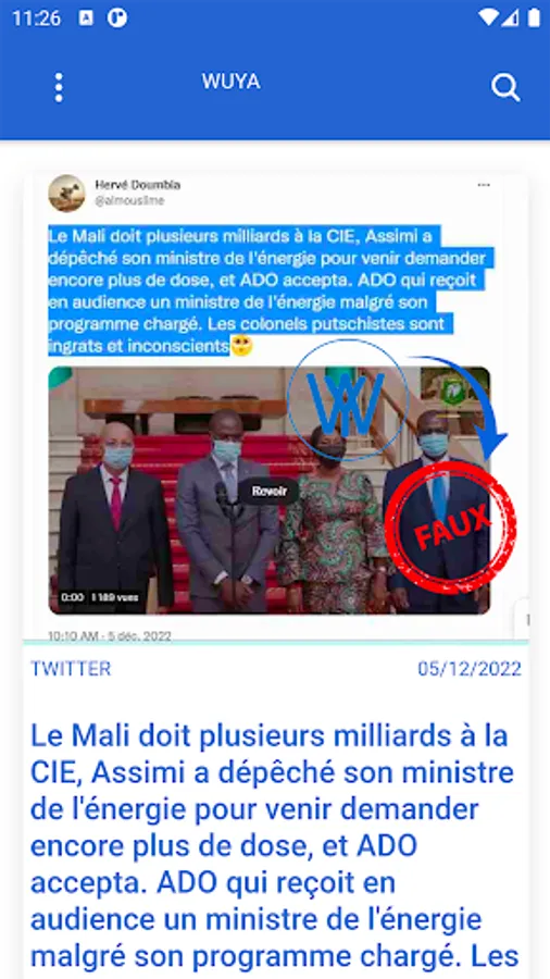 Wuya is a news checking app. It helps to differentiate between real information and false information. It has qualified verifiers, who work day and night to process information from social networks, televisions, radios, websites and others.