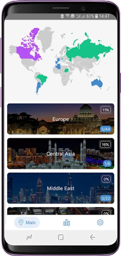 The list of all continents: Europe, Central Asia, Middle East, South Asia, North America, East & Southest Asia, Central America, South America, Africa, Australia & Oceania.