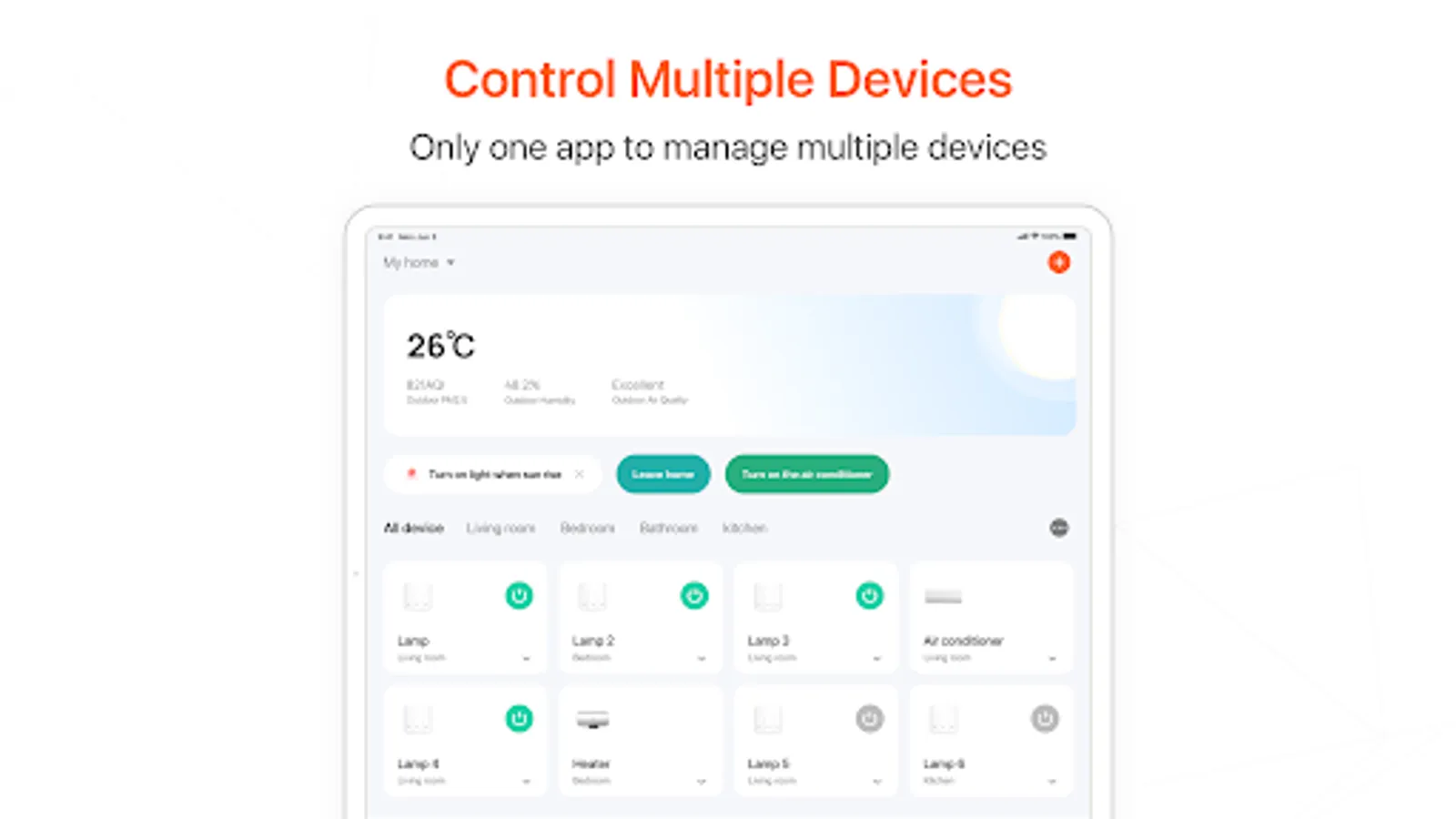 • Interworking of multiple smart devices. Devices automatically start/stop working based on temperature, location and time.