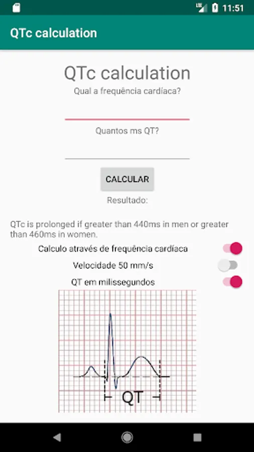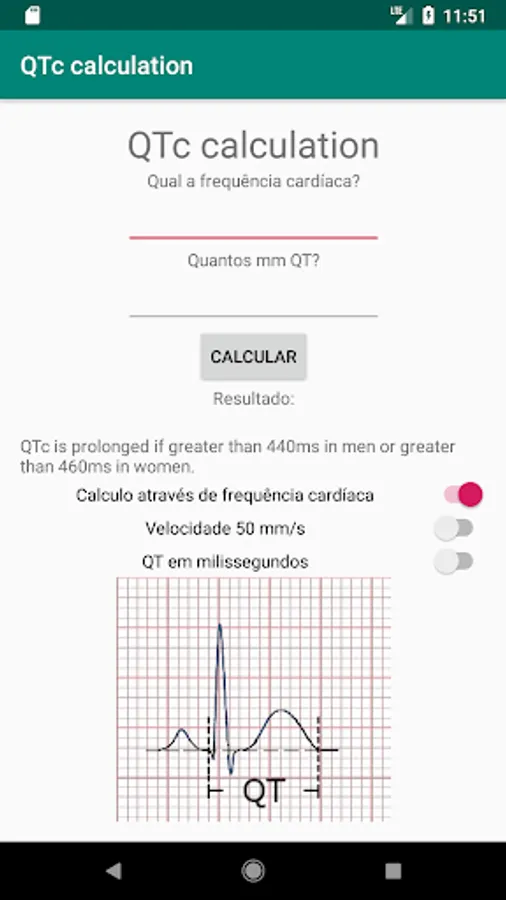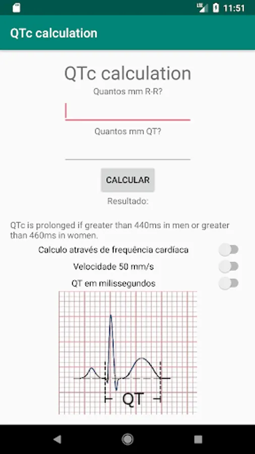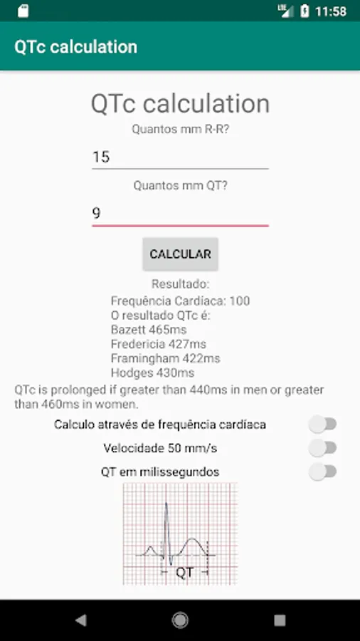 This is a simple application to calculate the QTc by millimeters or millimeters. Both are the easiest ways for the clinician to use it in their daily lives.