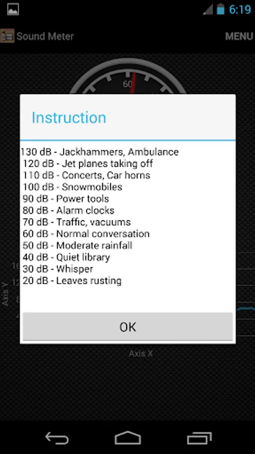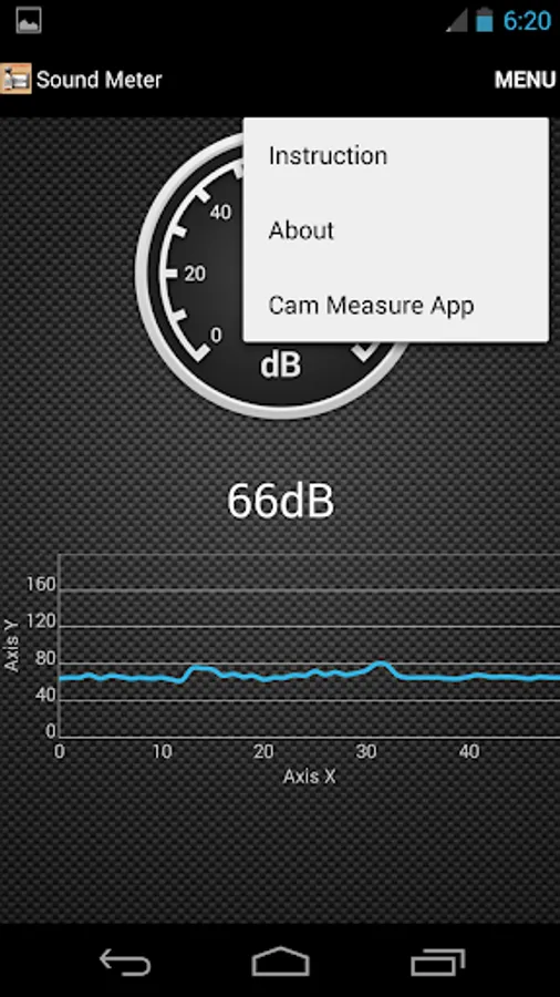 Sound Meter is professional sound meter for your Android. Sound Meter is also known as sound level meter, decibel meter (dB meter), noise meter, sound pressure level meter (SPL meter). Sound Meter uses your Android's microphone to measure levels of noise or sound pressure levels and displays measured data in dB (decibels) with reference to generally known noise (provided by American Academy of Audiology) or displays the noise data on easy to read graph for the last 30 seconds of app use.