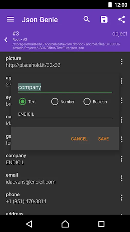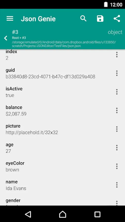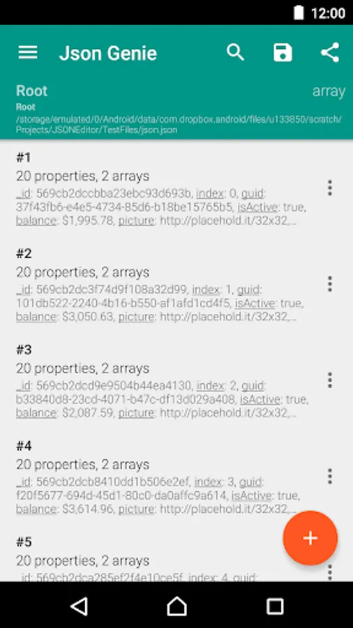 Because Json Genie uses the default Android way of opening files, it can open a json file from all sources available on your Android phone (Dropbox, Drive, SD, ...). You can even copy/paste your custom json text or open a URL.