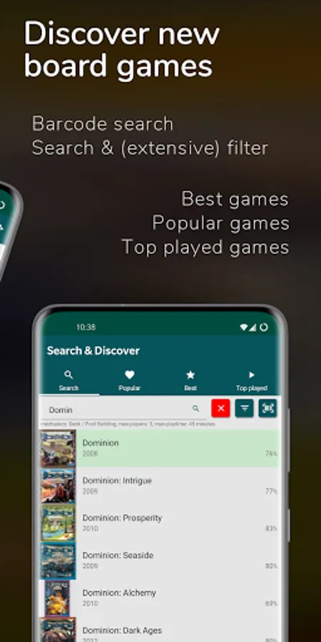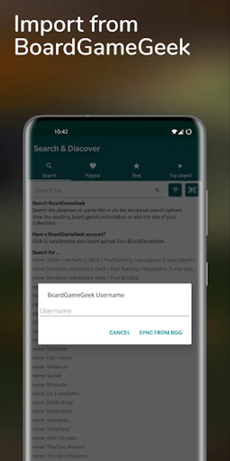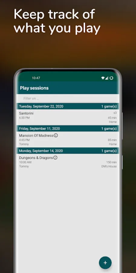 Log your play sessions and keep track of what, when and where you played. You can also log who played and who won and with what score. Never forget.