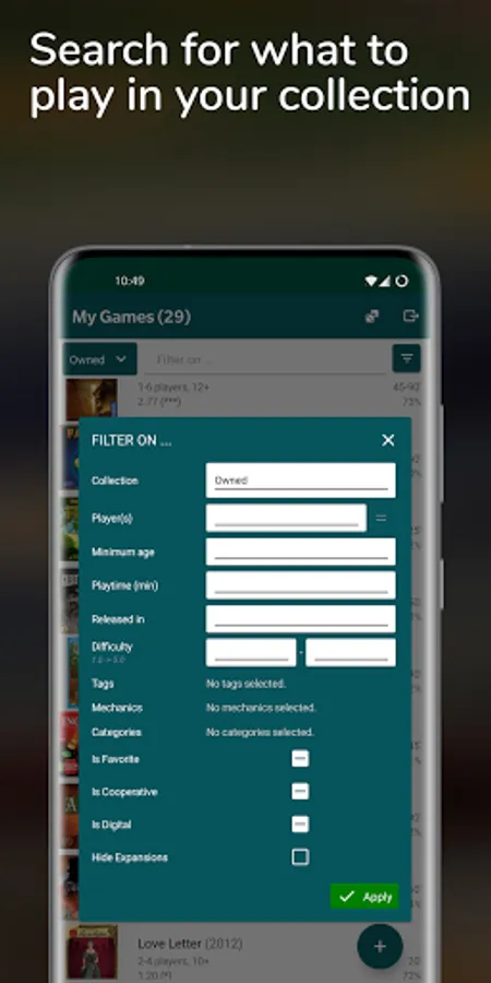 Choosing a boardgame to play is not always easy, that is why we give you multiple options to filter your collection: name, cooperative play, number of players, playtime, release year, is digital, difficulty, tags or/and a favorite.