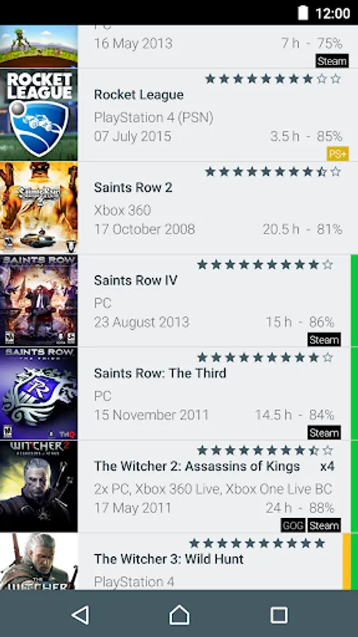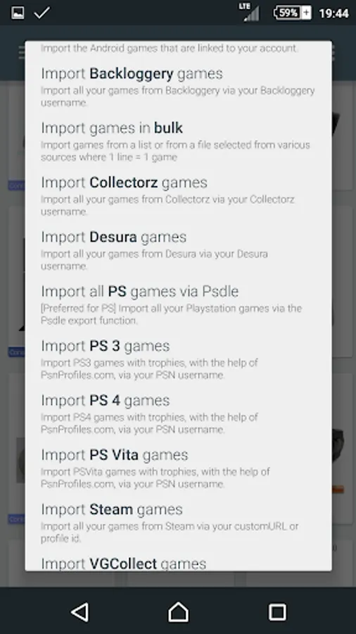 Import your games from various sources: Steam, Playstation 3/4/Vita, Xbox 360, Xbox One, PlayStation Plus, Xbox Games With Gold, VGCollect, Android, Backloggery, Collectorz, PSDLE, Desura, Itch.io, How Long To Beat, RF Generation, Generic CSV, Generic TXT .