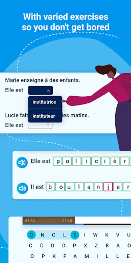 - The exercises are diverse so that you don’t get bored (multiple choice questions, crosswords, fill-in-the-blank texts, etc.),