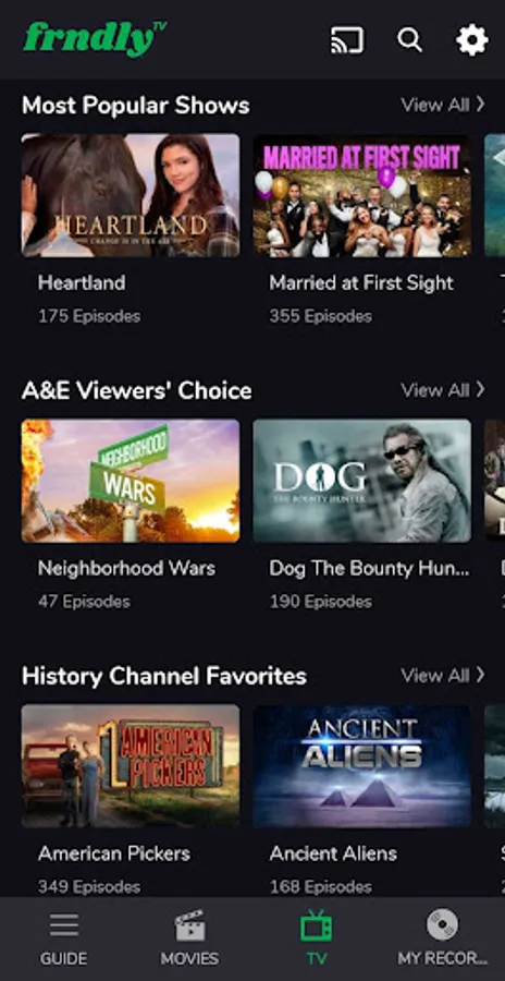 Full channel list: The HISTORY Channel, Hallmark Channel, INSP, Lifetime, MeTV, A&E, Hallmark Movies & Mysteries, Game Show Network, LMN, FETV, Hallmark Drama, Heartland TV, Crime & Investigation, UPtv, FYI, Great American Family, Great American Living, Start TV, Story Television, H&I, Circle, Dove Channel, PixL, Dove Family Movies, Dove Kids, getTV, FMC, Curiosity Channel, Curiosity Stream, Military History, Vice, Outdoor Channel, Sportsman Channel, World Fishing Network, Baby First TV, BYUtv, QVC, Movies!, ION, ION Mystery, Grit, Cowboy Way, Catchy Comedy and more!